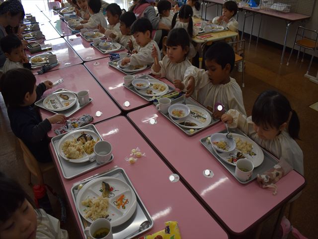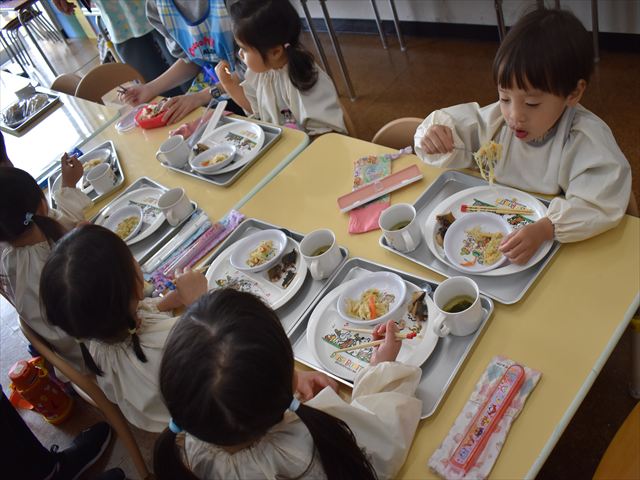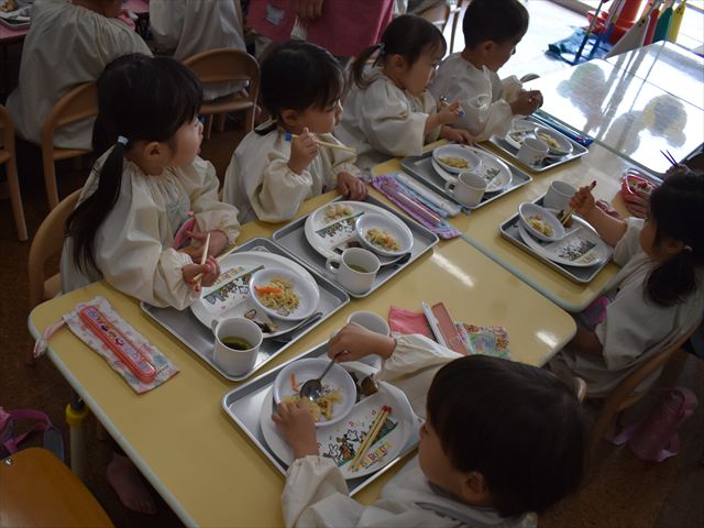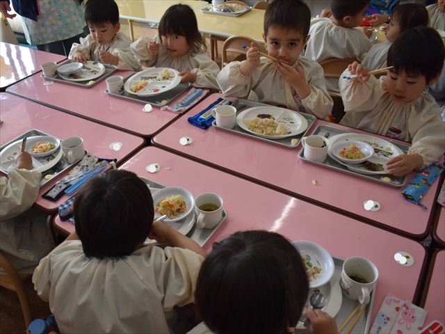 月曜日から金曜日まで、パンダ組・桜組の保育室から近い、厨房で作っていただいた手作りの給食を美味しくいただいていますよ🥢