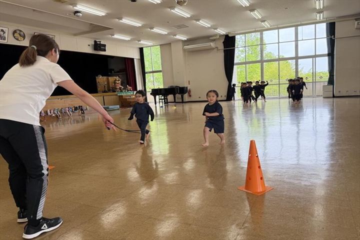 最後にかけっこをしました☆オレンジのコーンをぐるっと回ってゴールしましたね。
