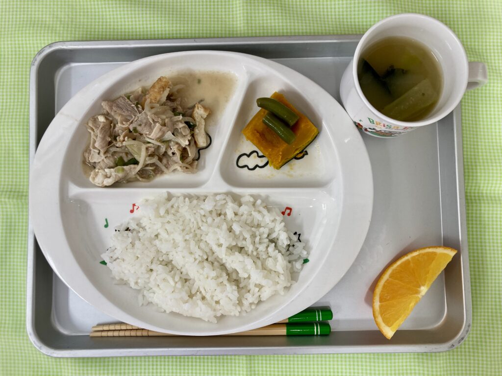 ごはん・大根の味噌汁・ポークケチャップ・春雨の和風サラダ・オレンジ
