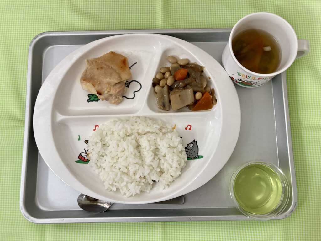 鶏そぼろごはん・白菜の味噌汁・白身魚の磯部焼き・筑前煮・みかんヨーグルト