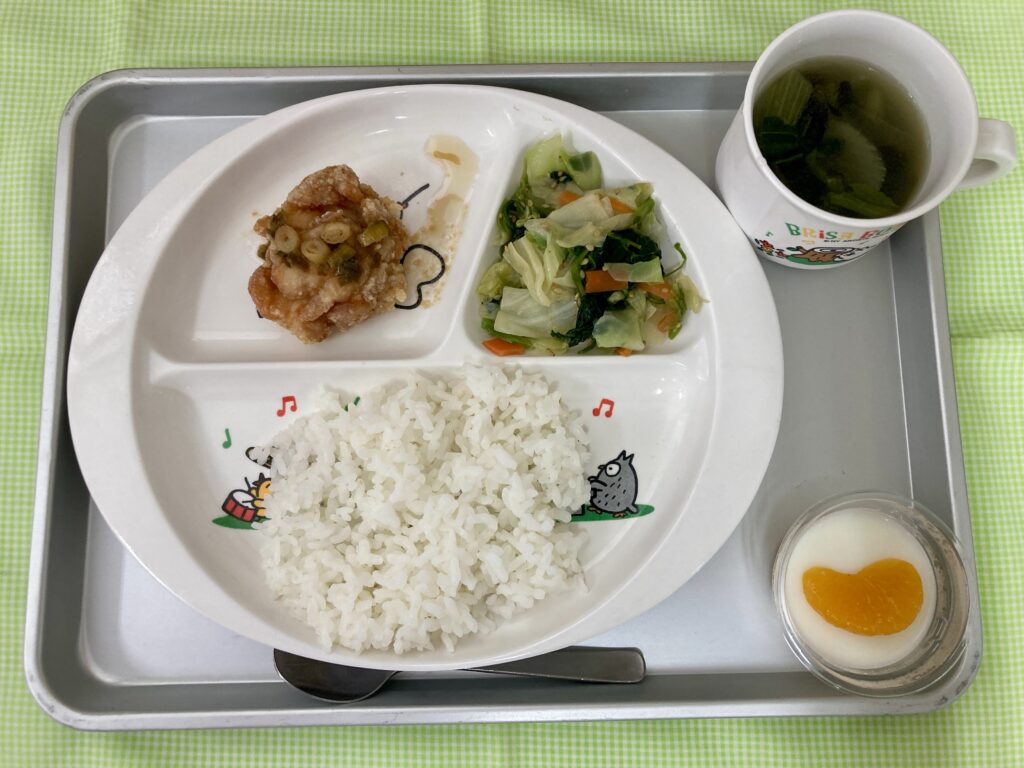 ごはん・チンゲンサイの中華スープ・揚げ鶏の甘酢ねぎソース・キャベツの中華風和え物・フルーツミルク寒天