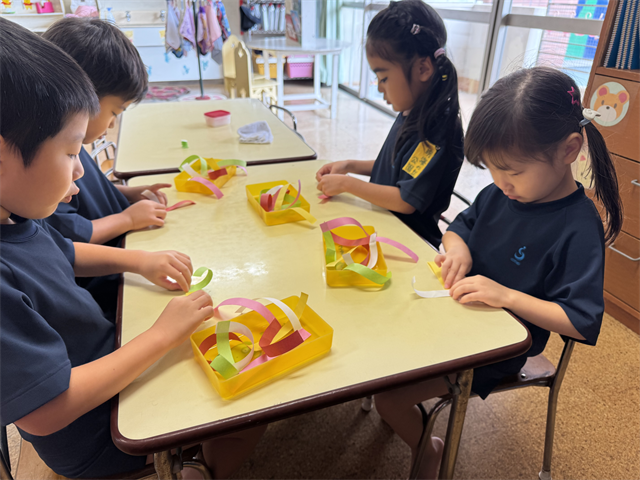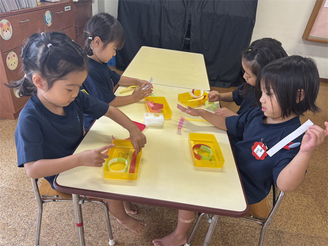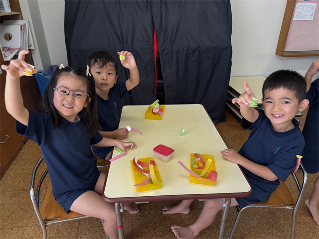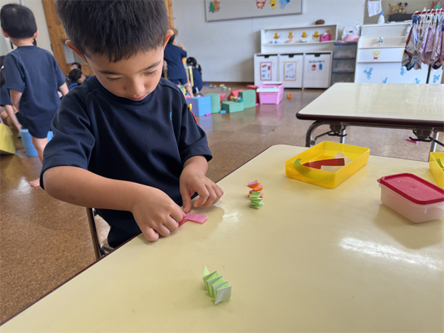 さっそく、自由遊びの時間に製作コーナーでじゃばら折りをして楽しんでいるお友だちもいました😊