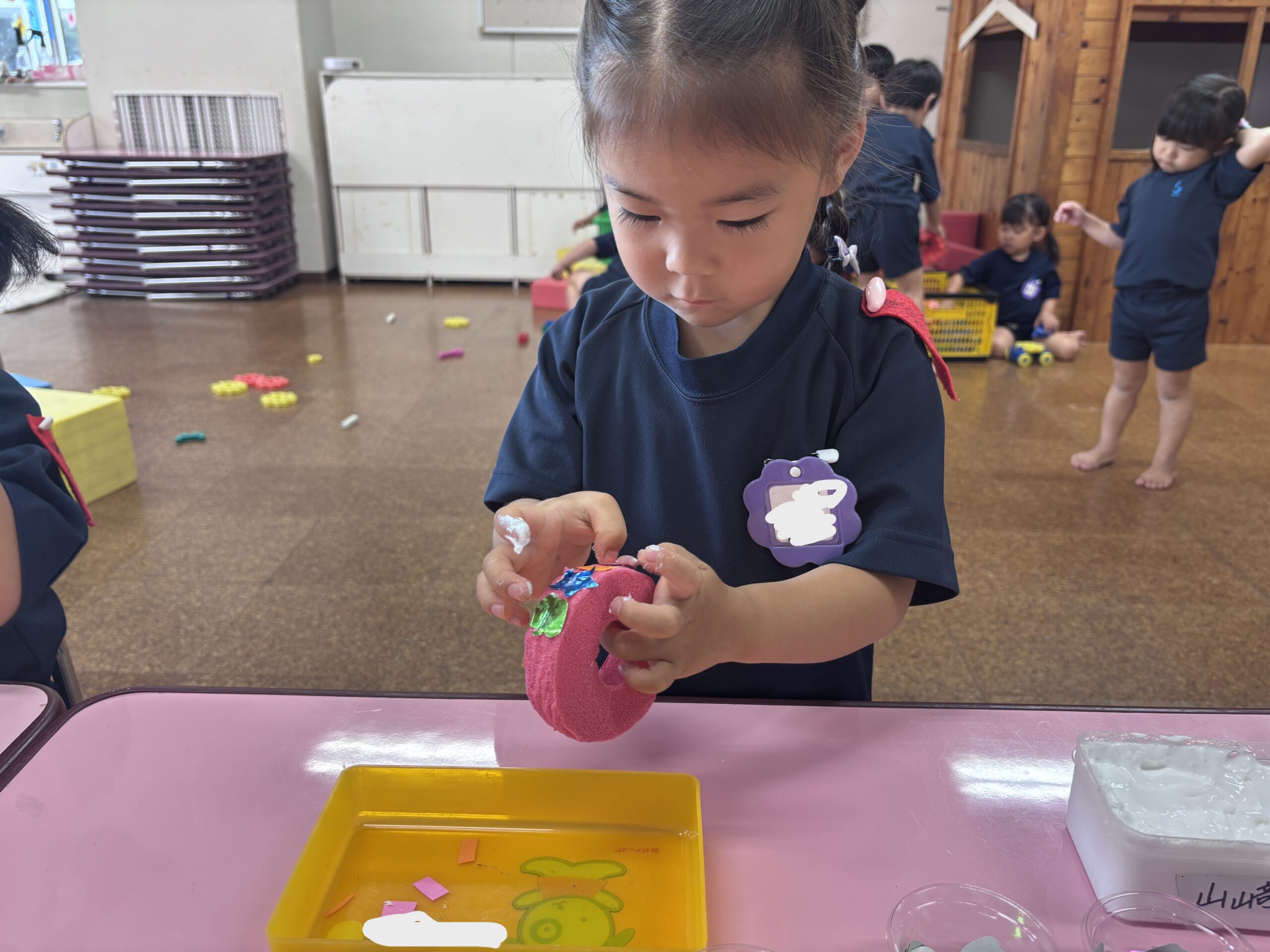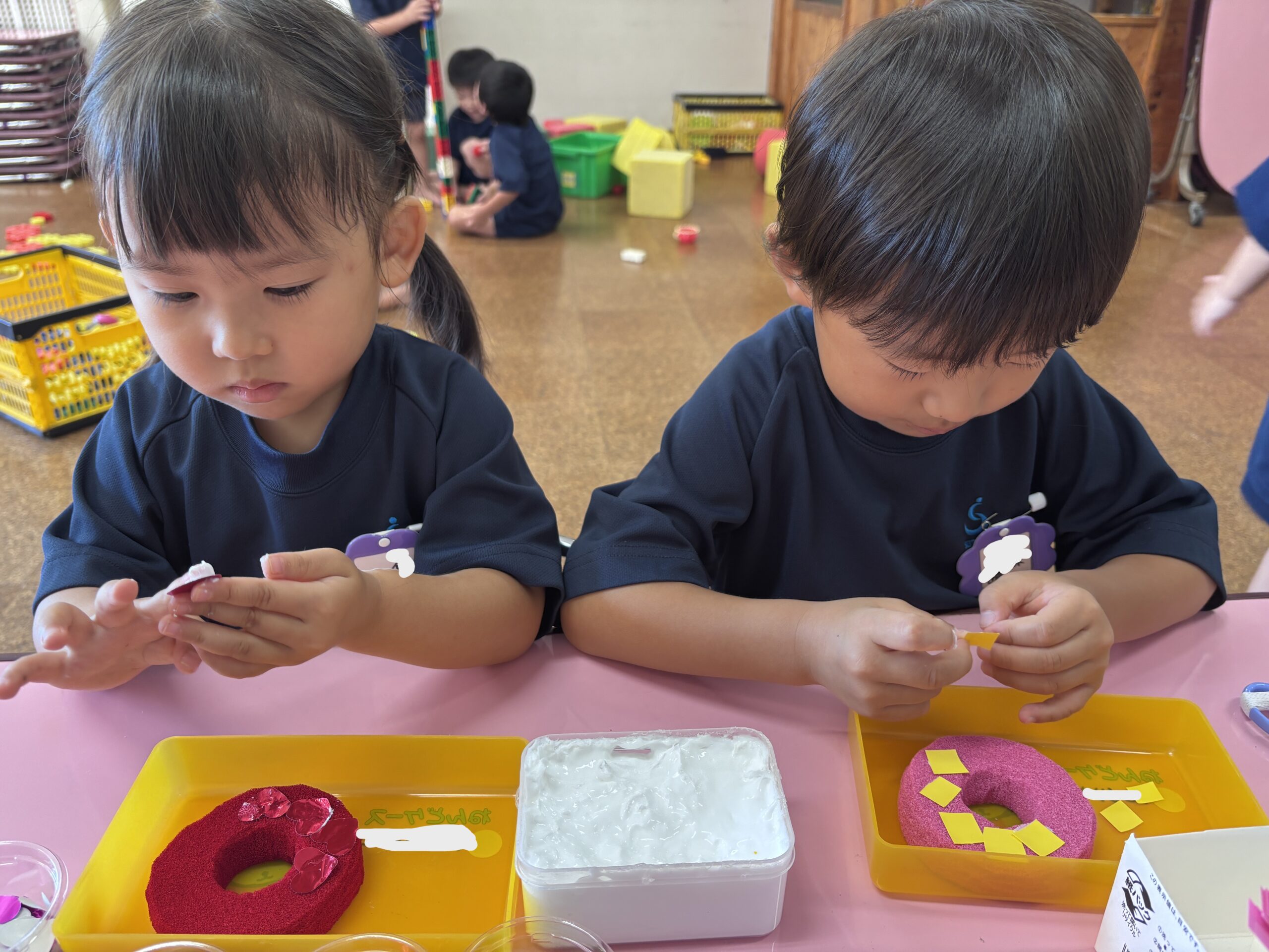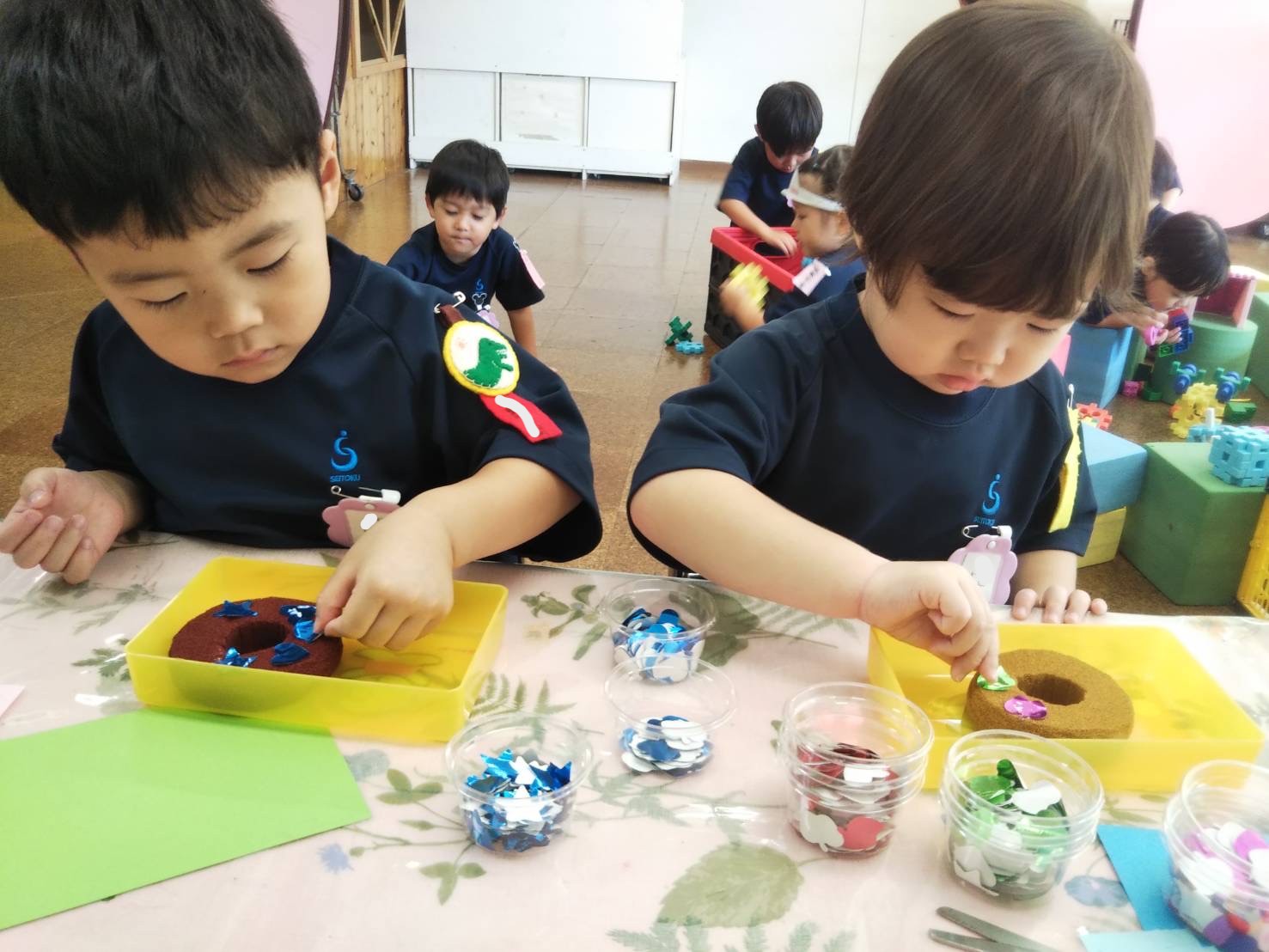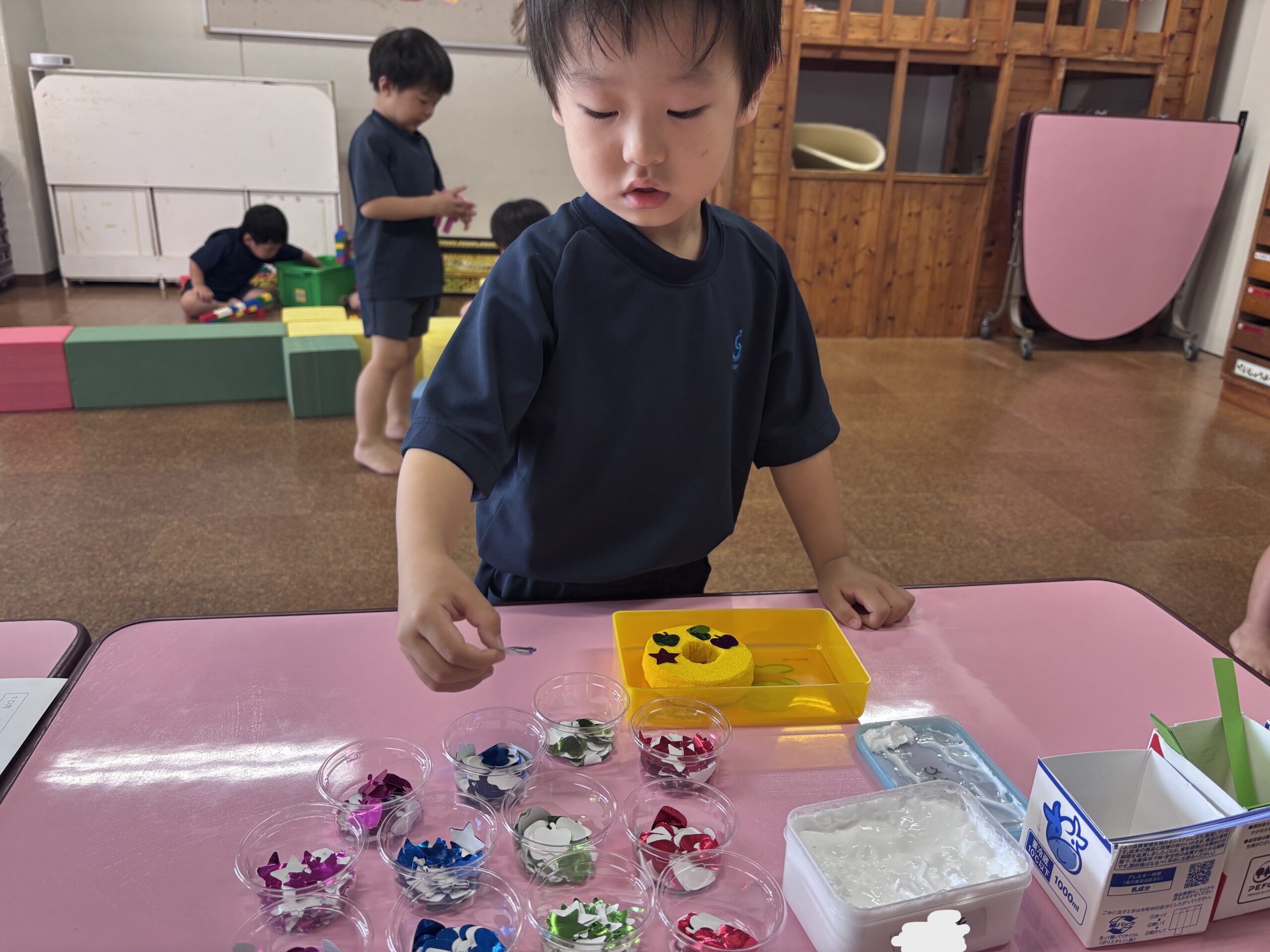 丸い形のものにキラキラ折り紙の貼紙や画用紙を一発切りしたものを飾りつけしました。