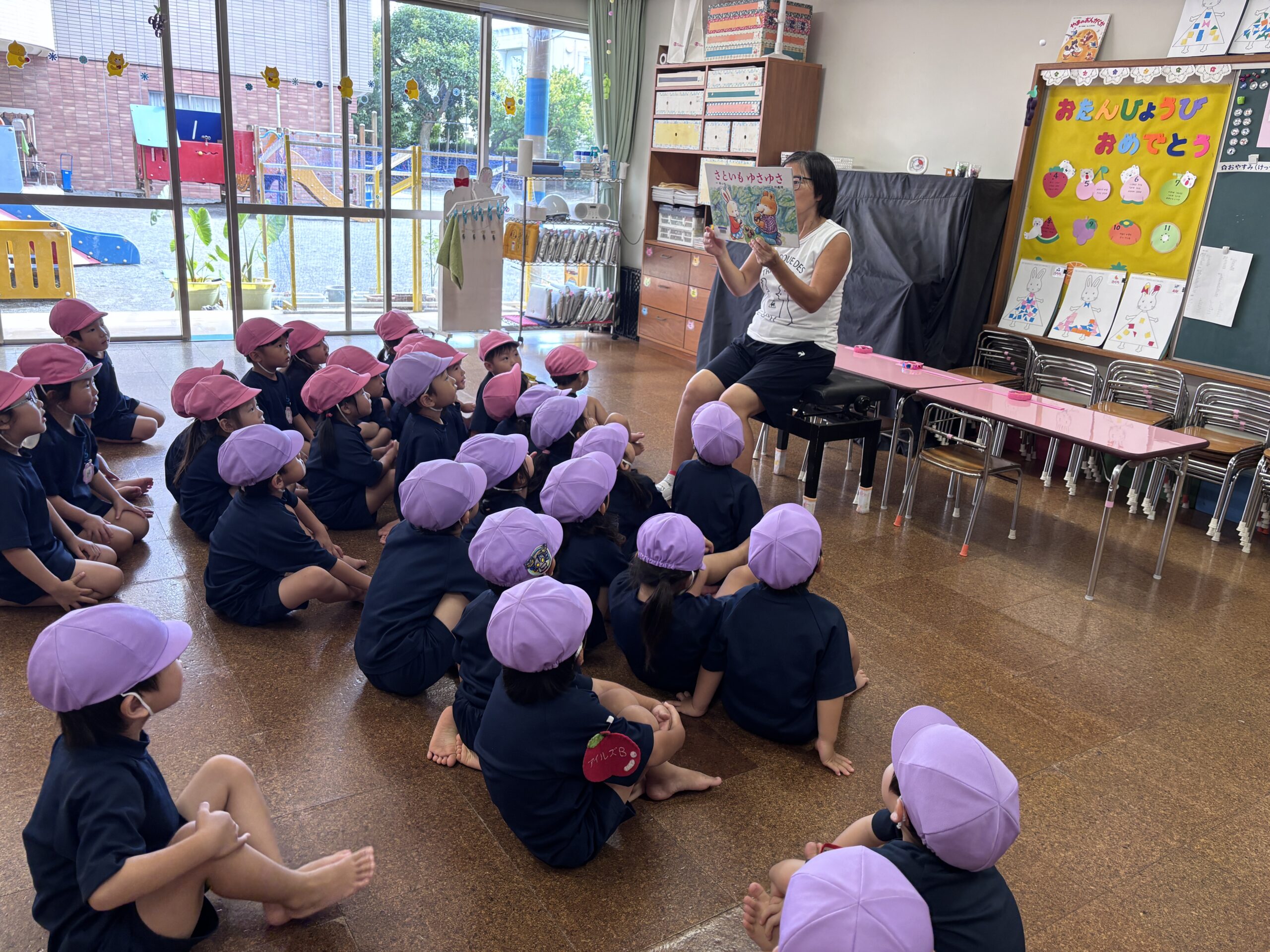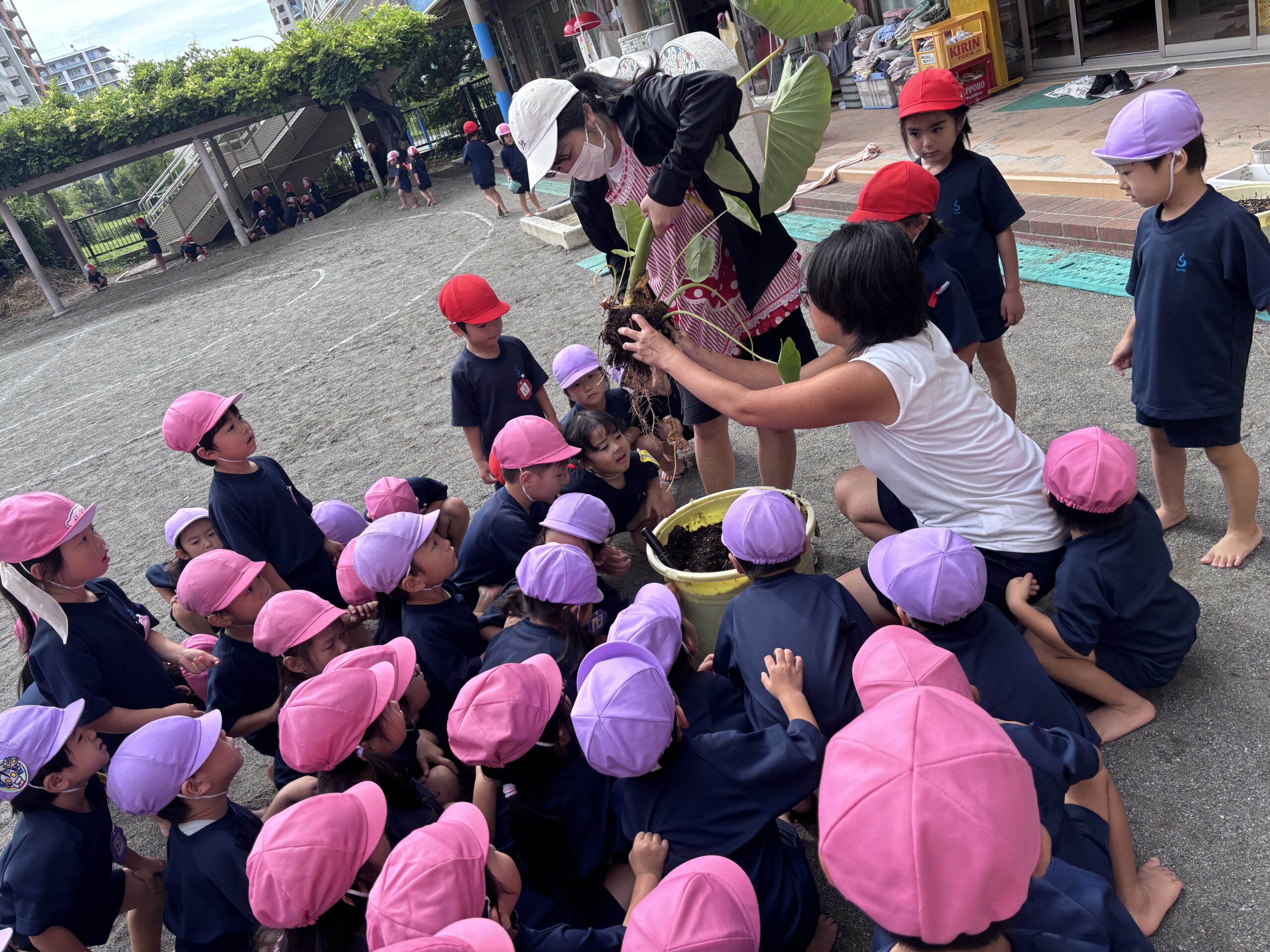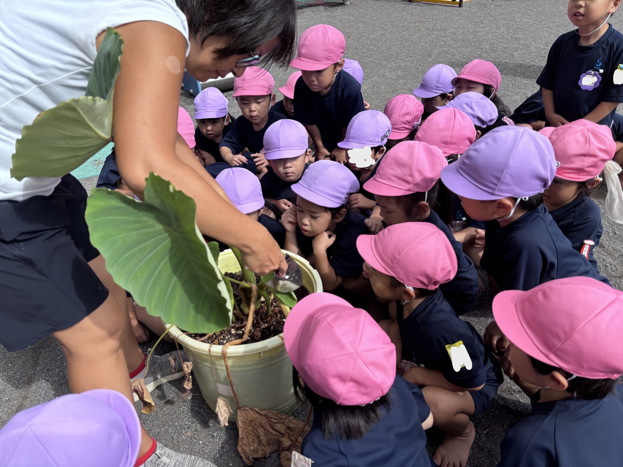 収穫する前に紙芝居を見て「桜組のサトイモいっぱいあるかな?」「小さいかな?」と期待を高めました。