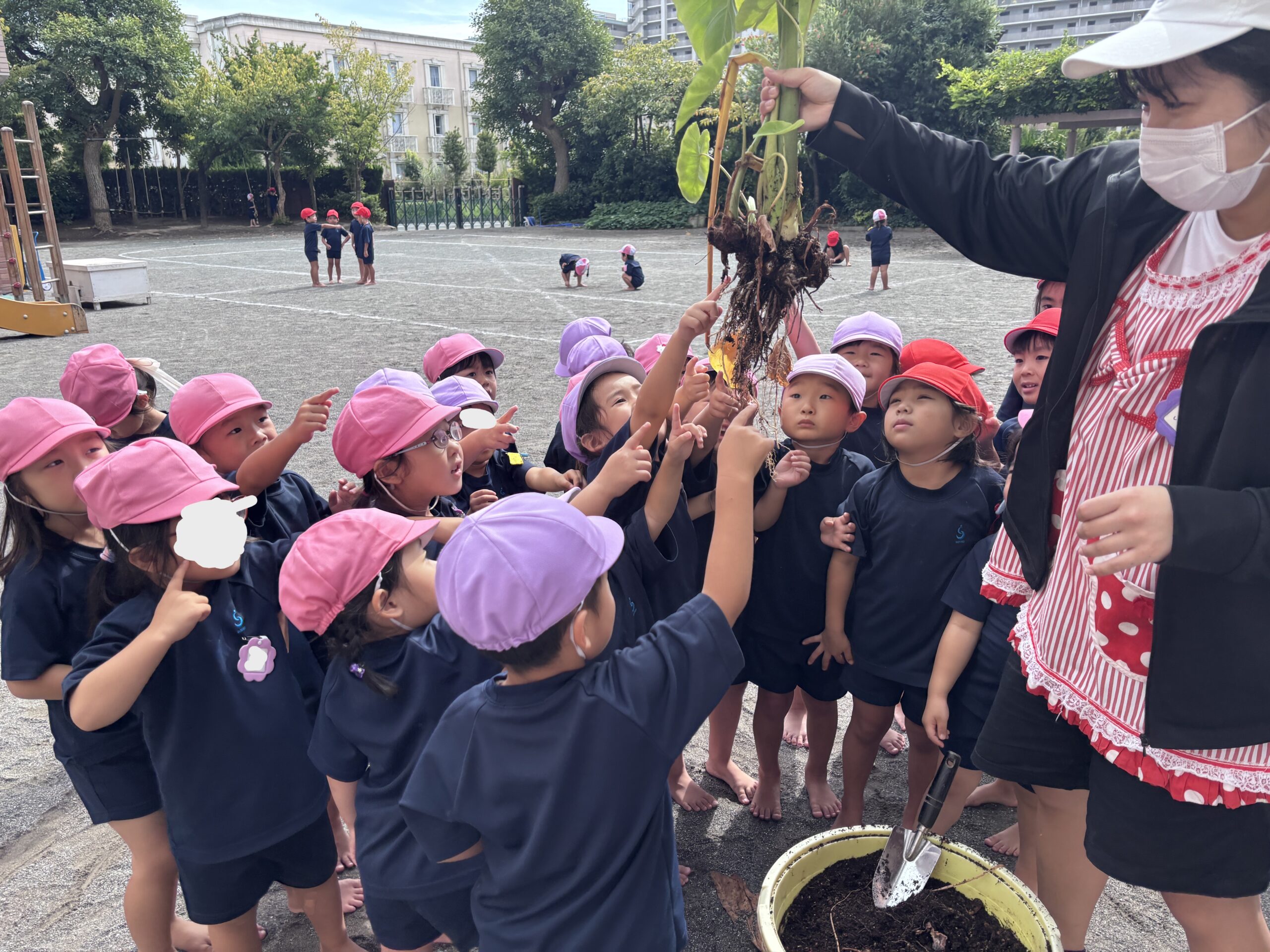桜組のお友だちと担任で「うんとこしょ どっこいしょ!」と言いながら引っ張ると…茶色の丸いものが!!!