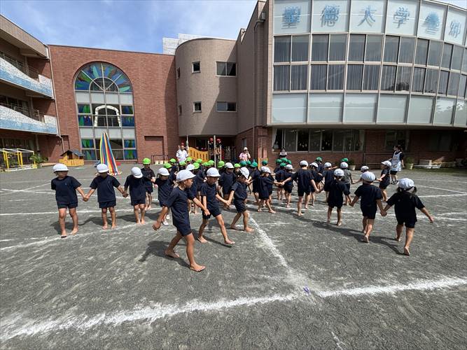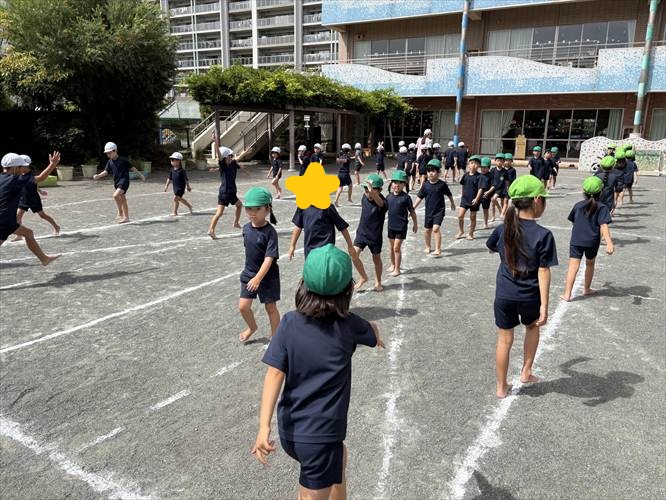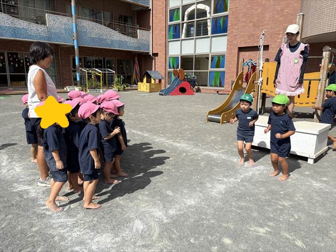 遊戯室との感覚の違いもあり、最初のうちは戸惑いの姿も見られていましたが繰り返し行うことで自分たちで間隔を取ることを覚えて取り組めるようになってきました。