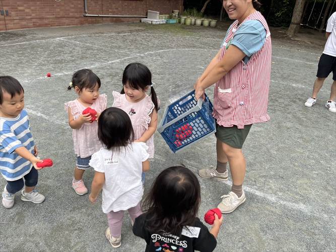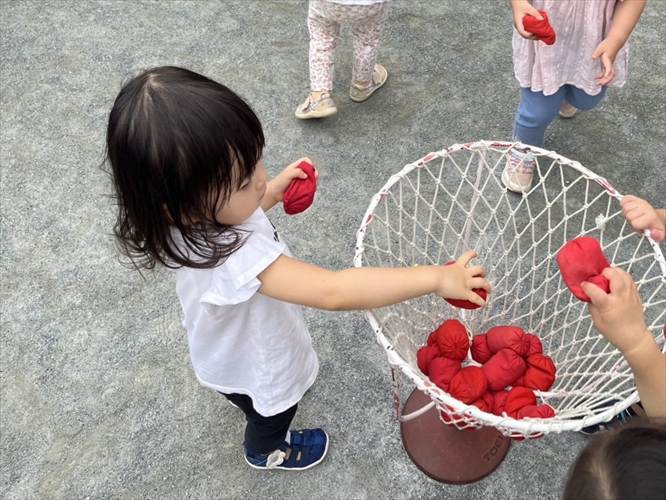 でも、みんな赤い玉をすぐに見つけてかごに「エイッ!!」