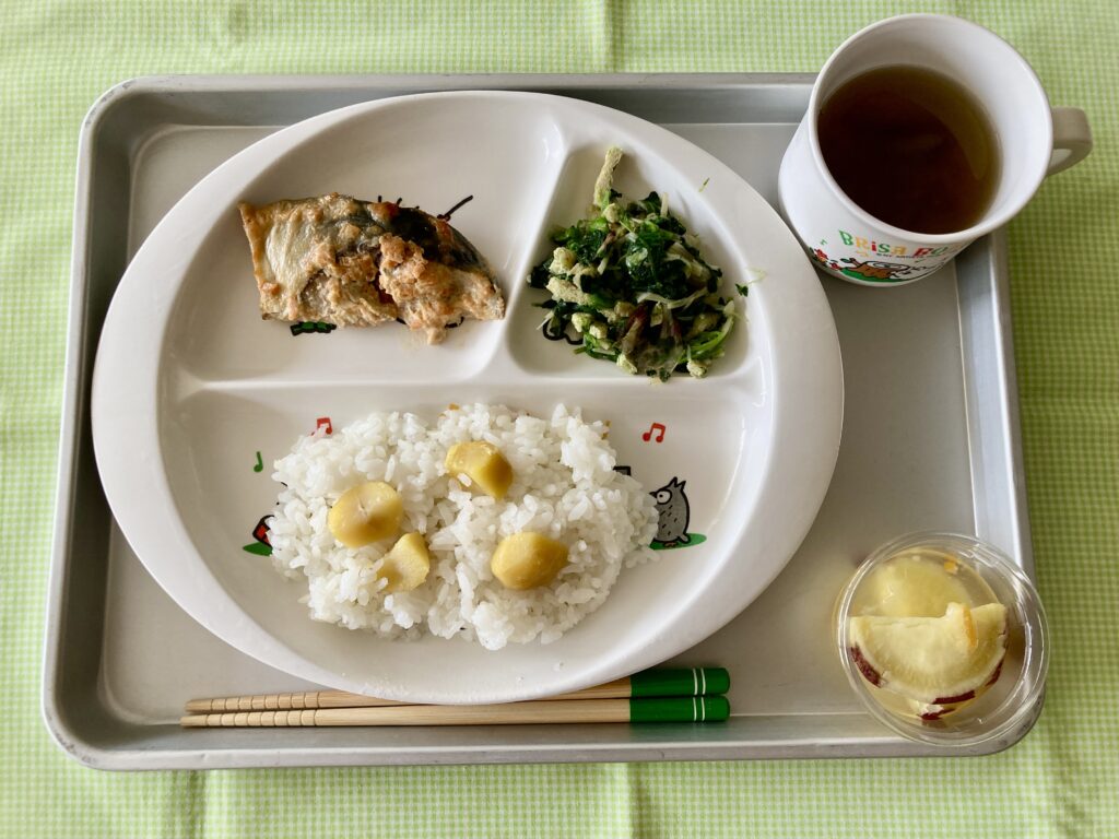 栗ご飯・絹さやのすまし汁・あじのもみじ焼き・ほうれん草ときのこのお浸し・さつまいものマーマレード煮