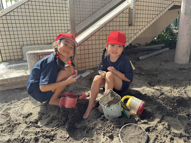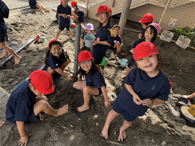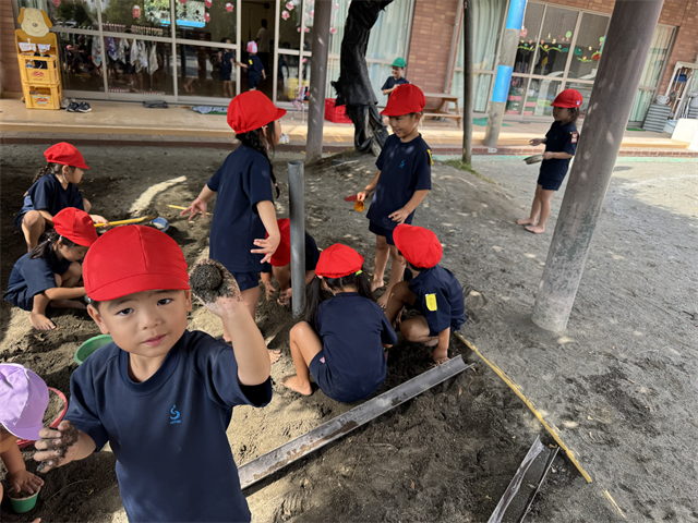砂場遊びでは、砂場の玩具や塩ビ管を使い、工夫しながら遊ぶ姿が多く見られます!