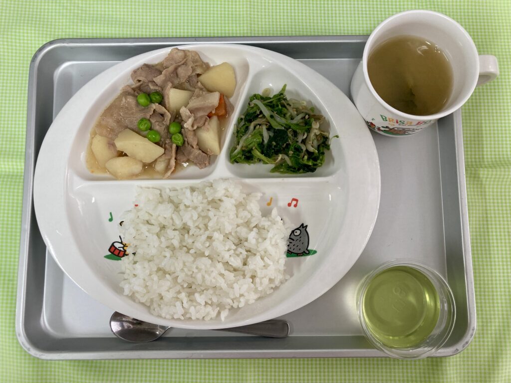 ごはん・大根の味噌汁・肉じゃが・ほうれん草の胡麻和え・青りんごゼリー