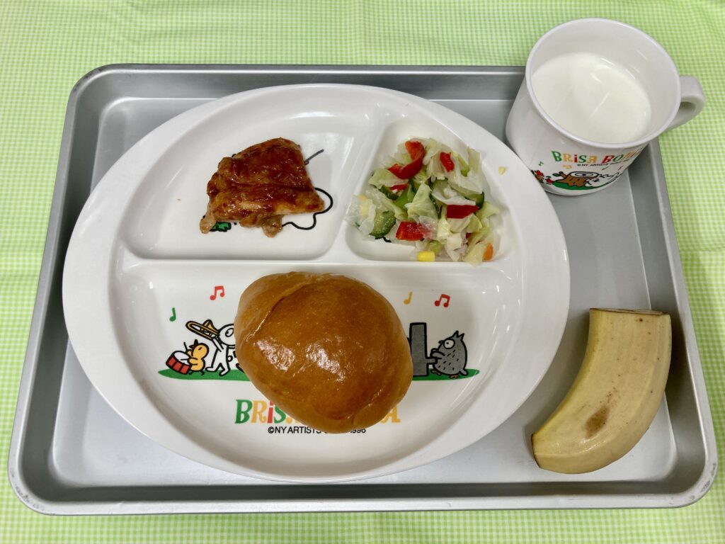 ロールパン・ミルク・チキンソテー バーベキューソース・カラフルサラダ・バナナ