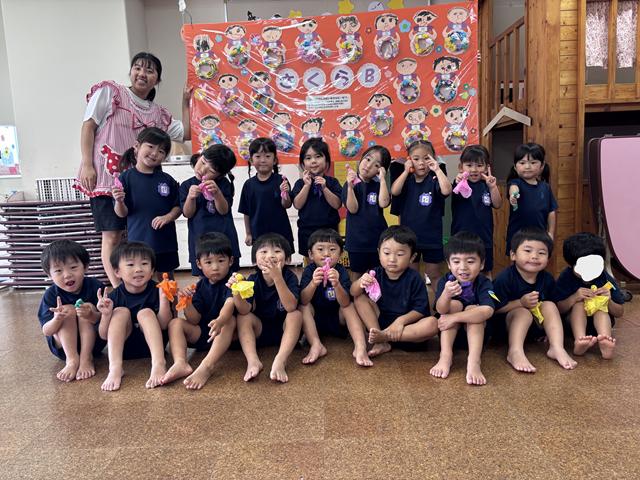 自分たちで作ったてるてる坊主と一緒に「にっこにこ にぃ☆」