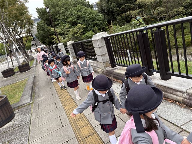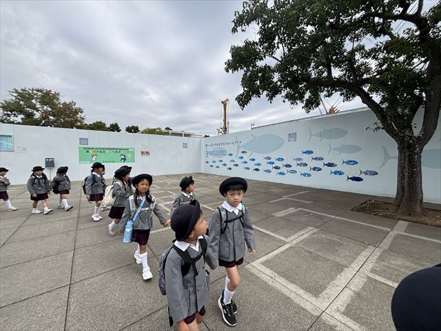 葛西臨海公園駅に到着し、水族園まではお友だちと手を繋いで歩きます。前の友だちと間を開けないよう一生懸命歩きました。