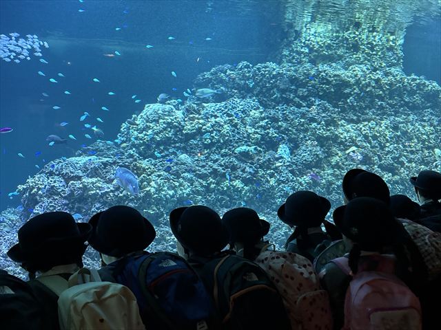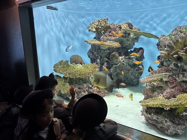 ガラスドームに入りドキドキしながらエスカレーターを降りると、早速たくさんの魚が泳いでいました。「あの魚大きいよ!」「この魚は色がキレイだね~」と様々な会話が聞こえてきました。