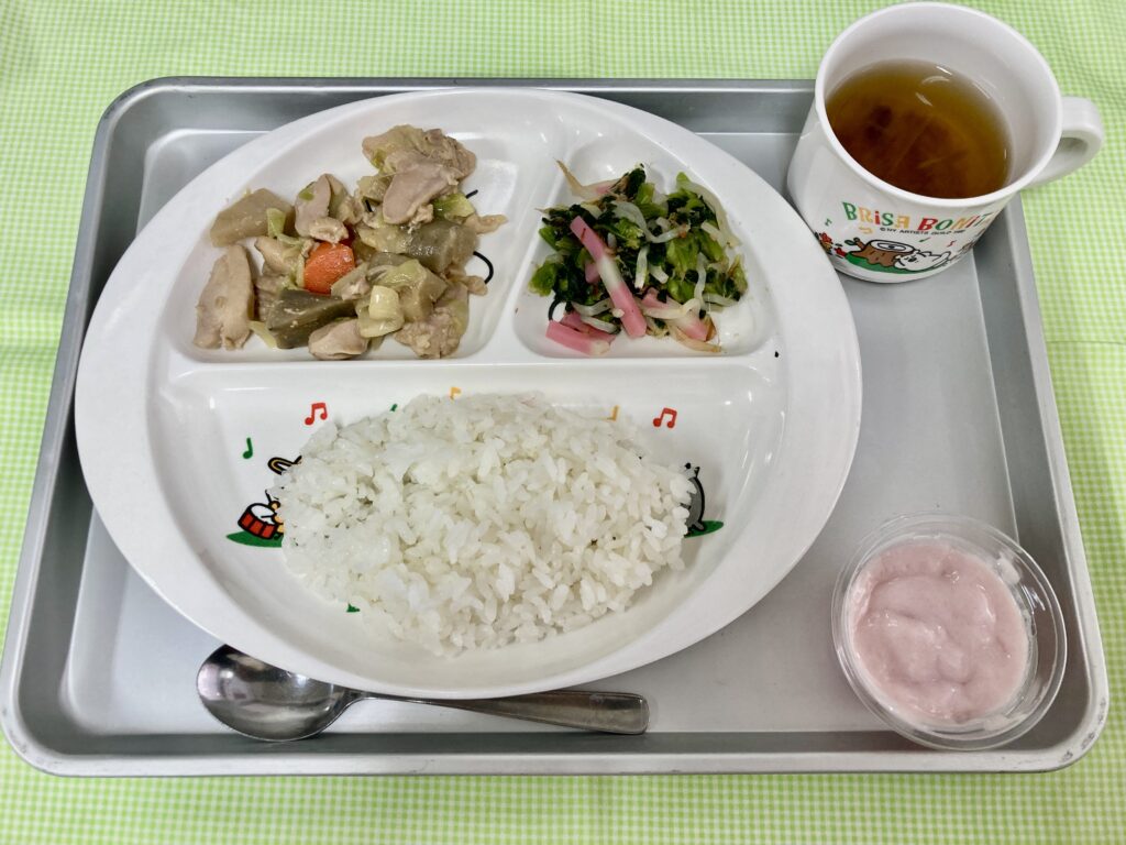 ごはん・きのこのすまし汁・鶏肉と根菜の味噌炒め・小松菜とかまぼこのおかか和え・いちごフルーチェ