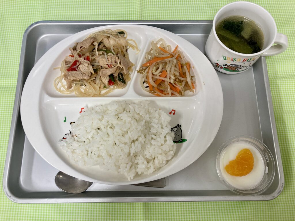 ごはん・チンゲンサイの中華スープ・チャプチェ・もやしのナムル・ミルク寒天