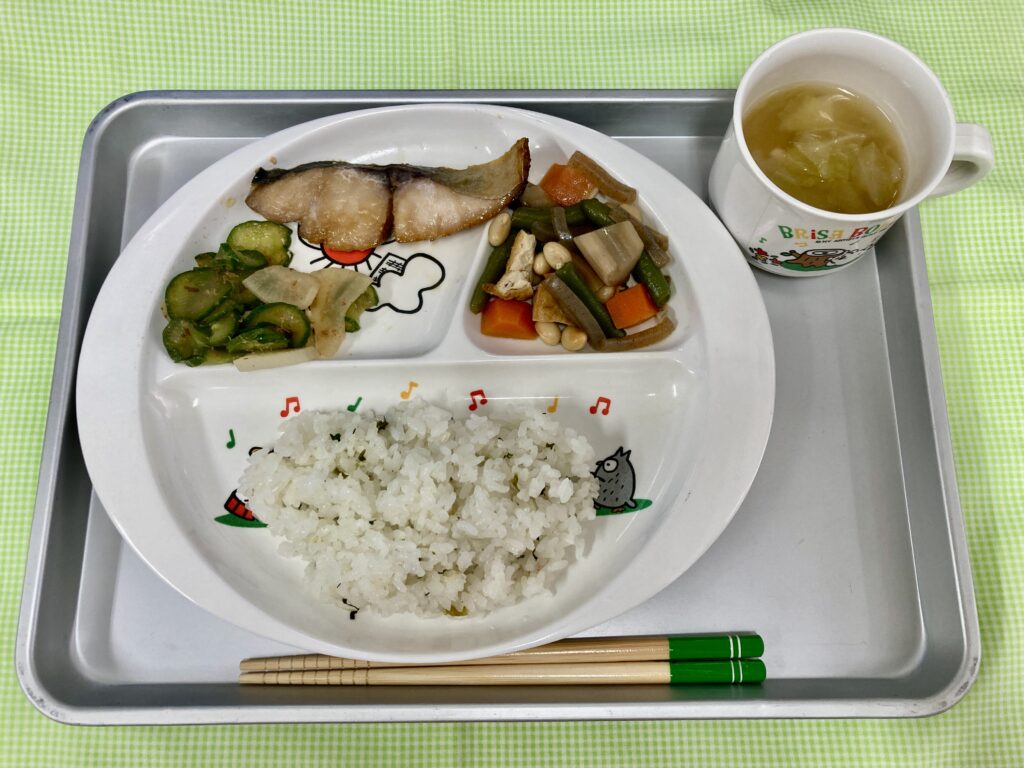 菜飯・キャベツの味噌汁・あじのかば焼き・五目煮・きゅうりの甘酢漬け