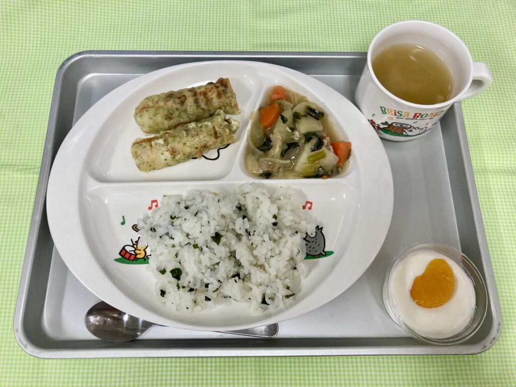 わかめごはん・大根の味噌汁・竹輪の磯部揚げ・野菜の和風煮・みかんヨーグルト