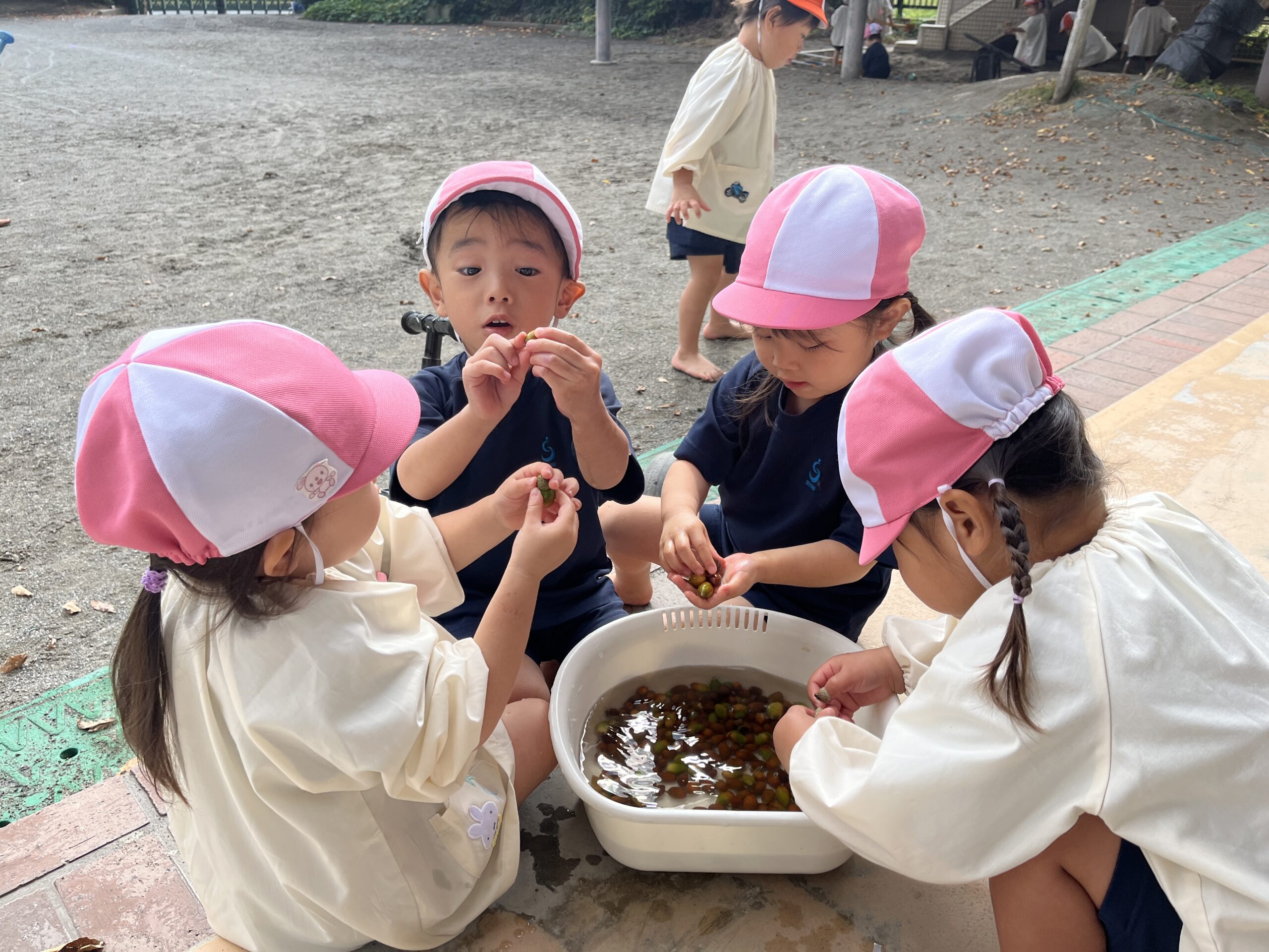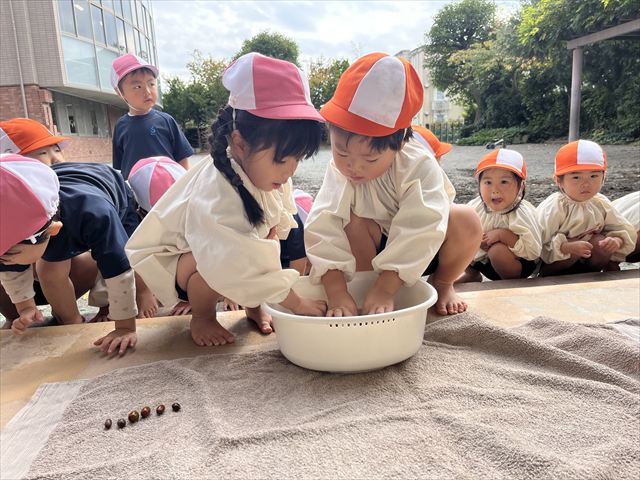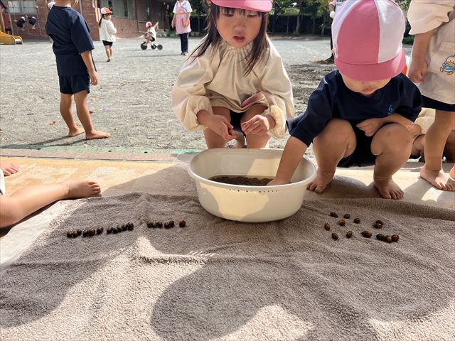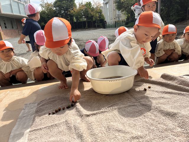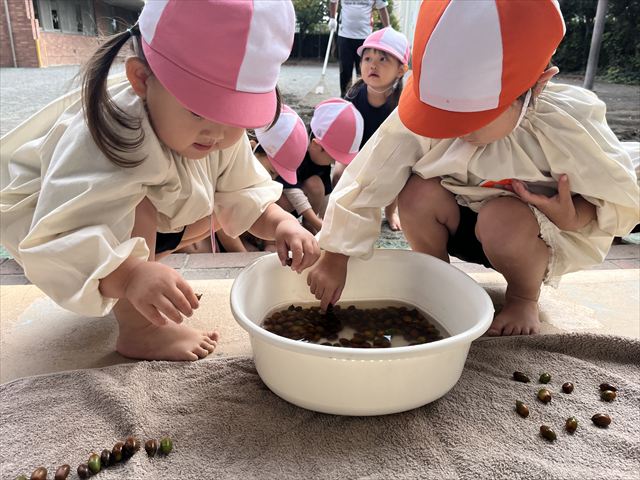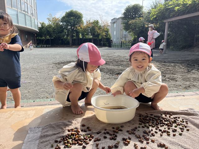 パンダ組のお友だちが園外保育で集めたどんぐり。翌日、気になったお友だちはバケツの中を覗いていましたよ。「虫さん、いないね~」「どんぐりいっぱい!」と楽しげな声が聞こえてきました。