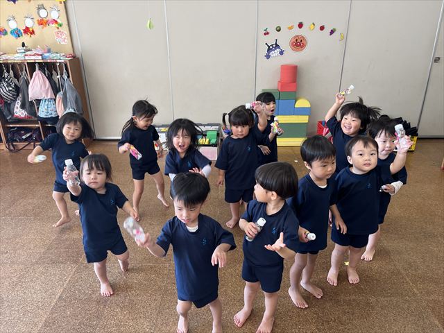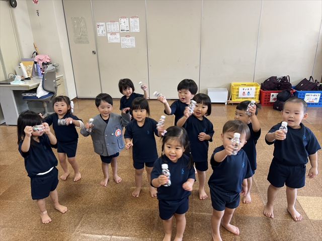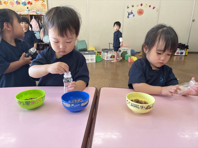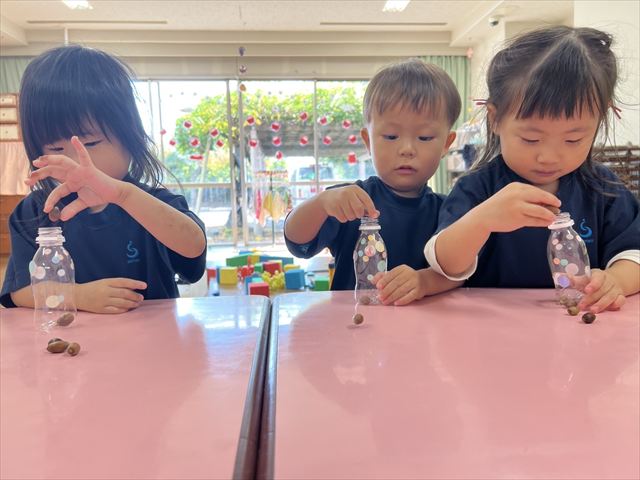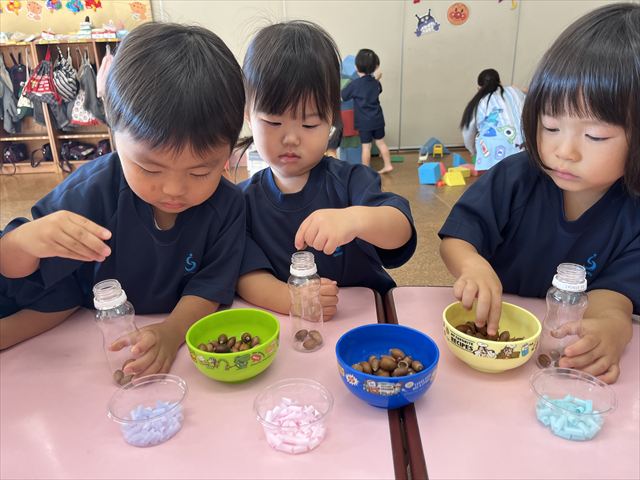 『マラカス』を作りました。指先でどんぐりをつまんで、空き容器に一つずつ落として、短く切ったストローも入れました。シールできれいに飾りつけもしましたよ。出来上がった『マラカス』を持って、手をフリフリフリ。音が出ることを楽しんでいるパンダ組のお友だちでした。