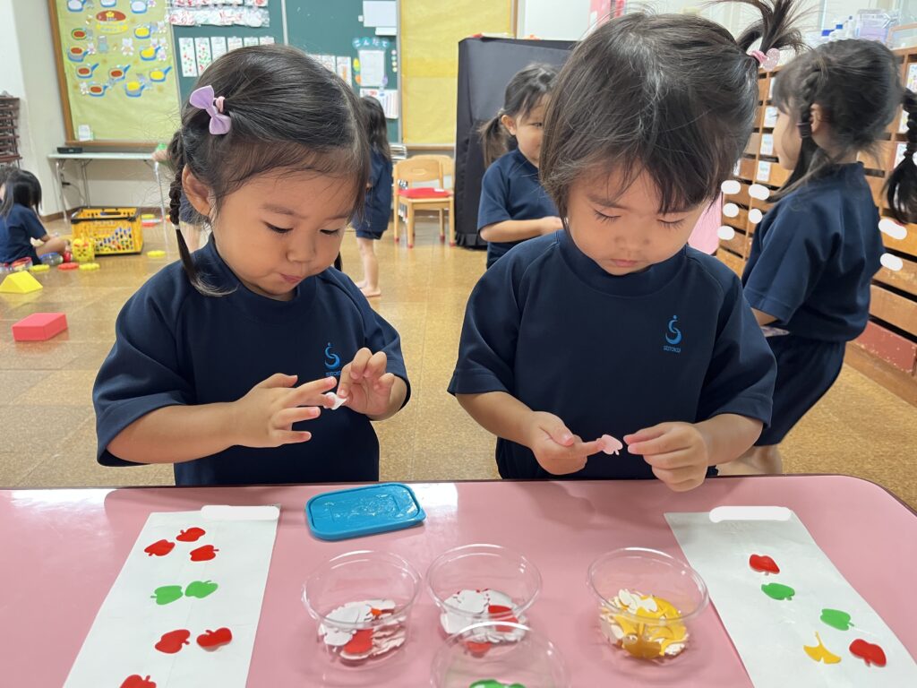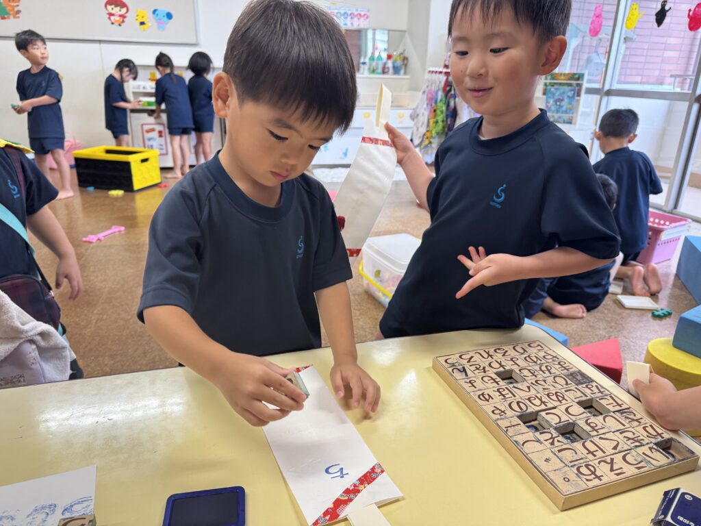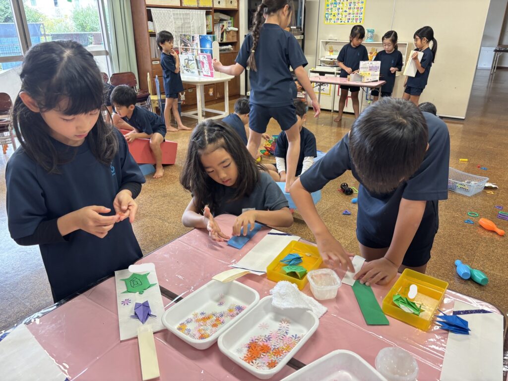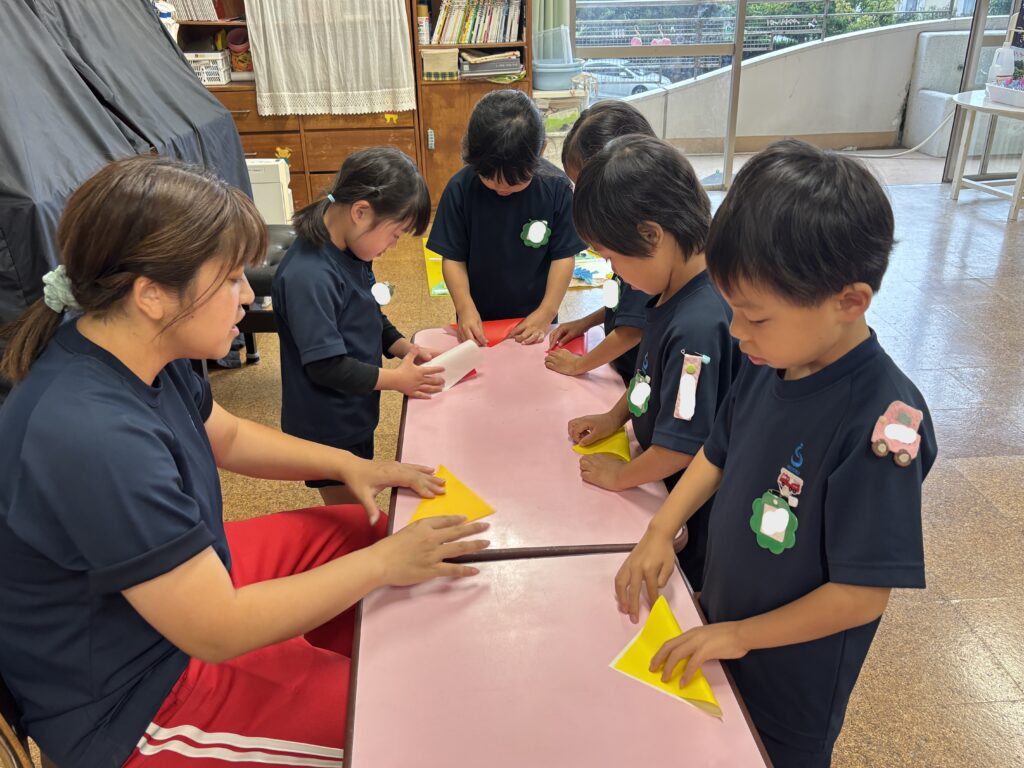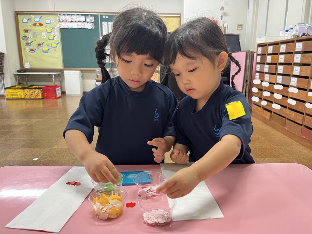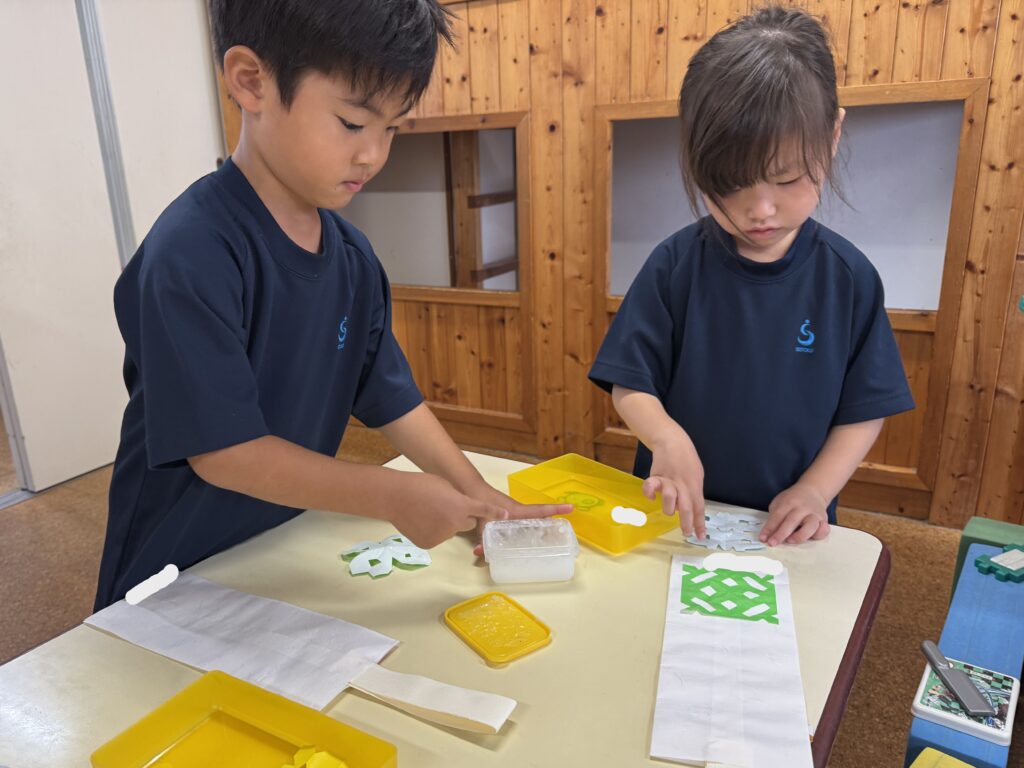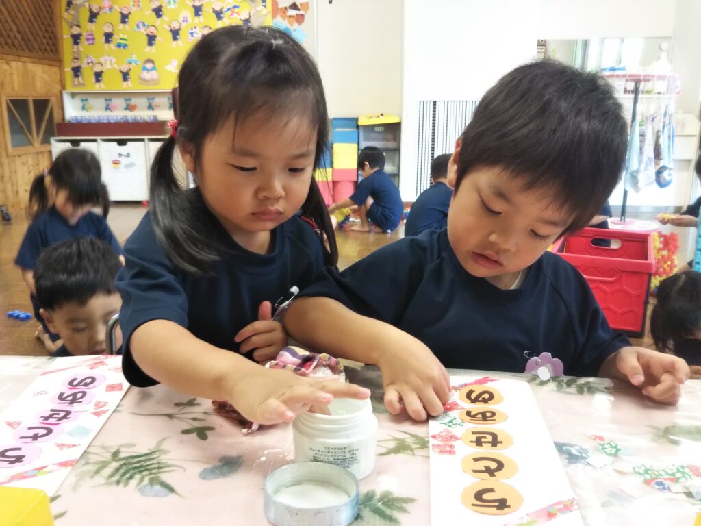 【ちとせあめ】と書かれた色の紙を自分で選び、小さな指で貼紙の糊付けを頑張りました。