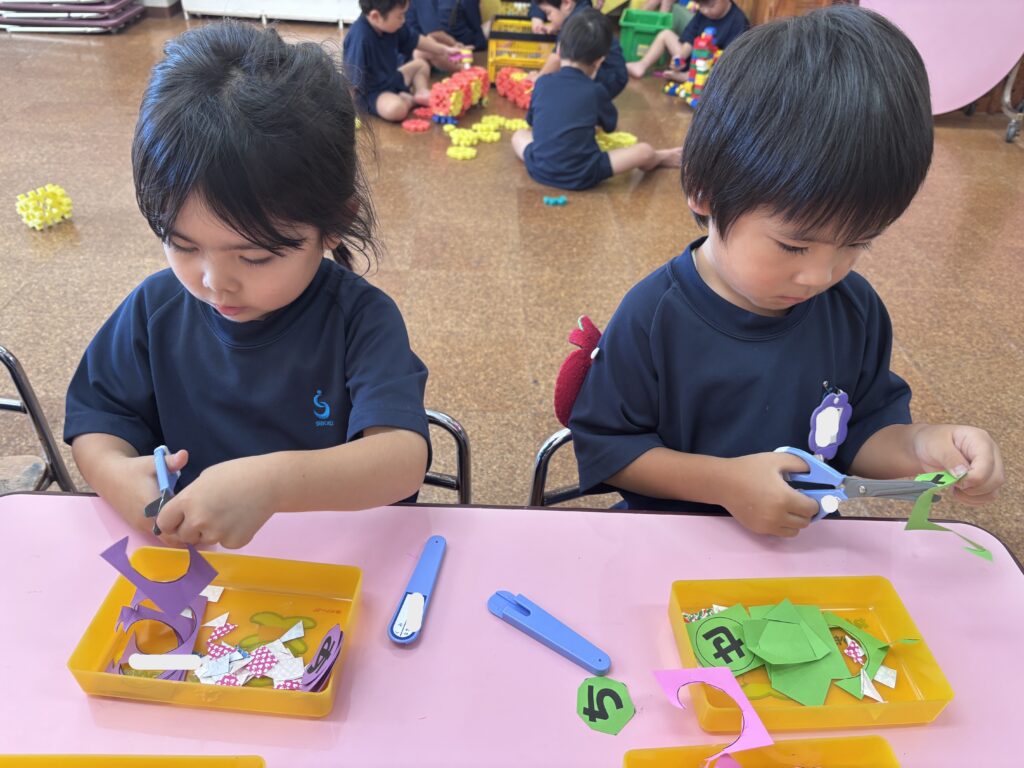 少しずつはさみの使い方も覚えてきたので、字が書かれた紙を丸く切って【ちとせあめ】の字を完成させました。