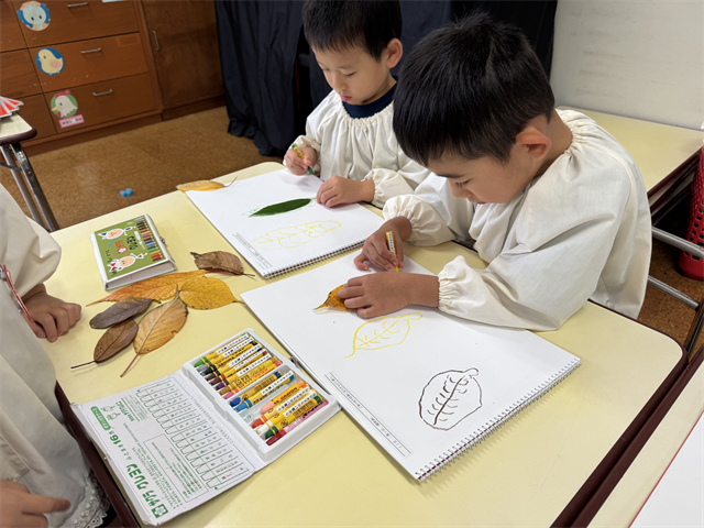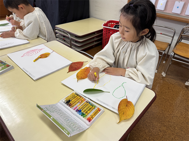 葉っぱをクレヨンで型取り、よく観察しながら葉脈を描きました🖍