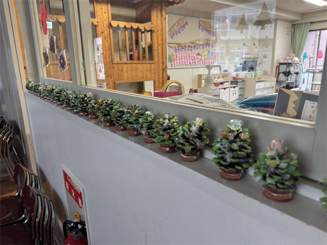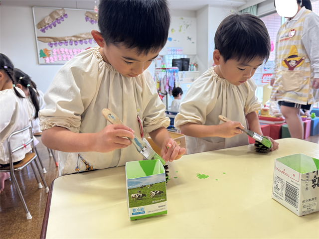 昨年は、教師が絵の具で色をつけたまつぼっくりに装飾をしていましたが、今年は自分たちで色も塗りました💗