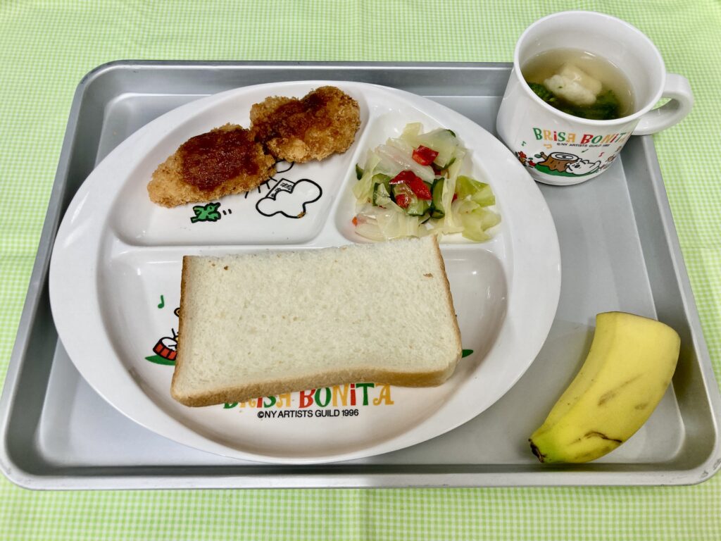 いちごジャムサンド・花野菜のスープ・白身魚のフライ・キャベツとパプリカのマリネ・バナナ