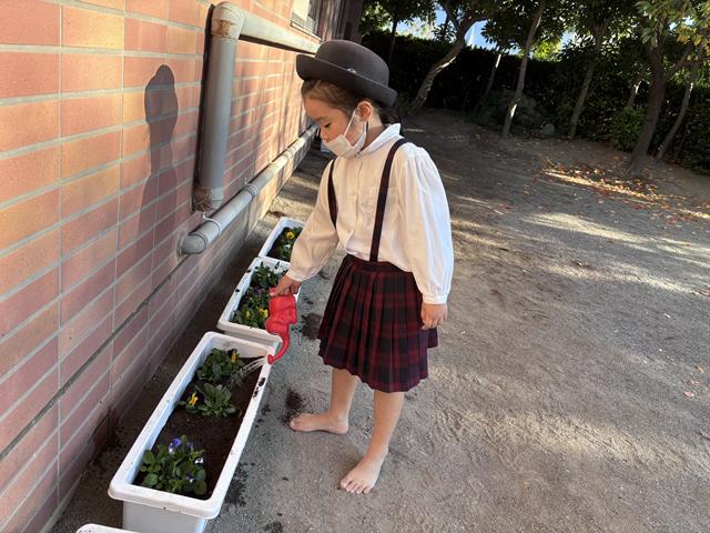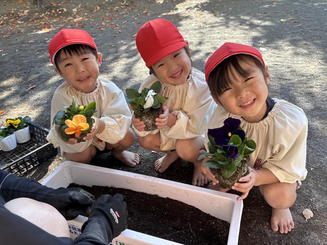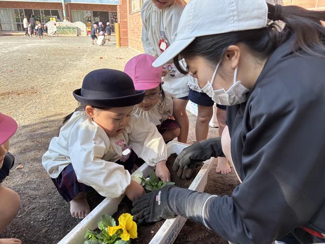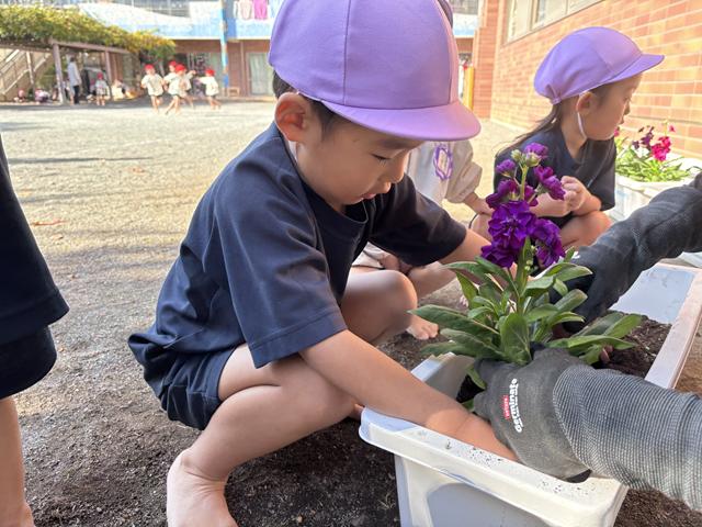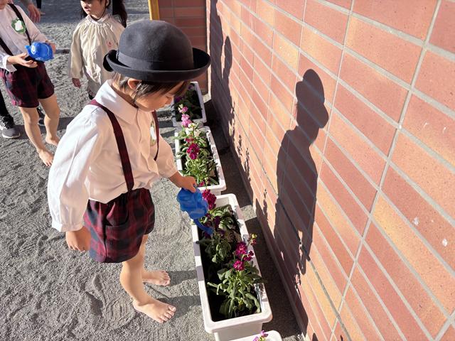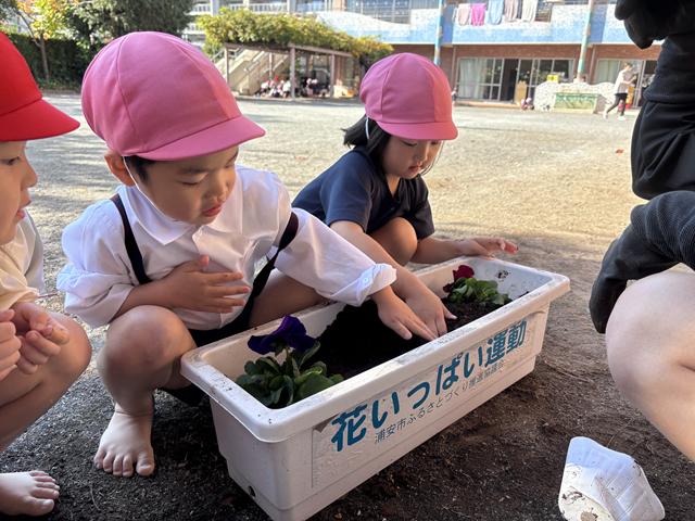 今日は浦安市の『花いっぱい運動』の方からパンジー、ストック、のお花の苗を頂き、早速浦安幼稚園のお友だちみんなでプランターに植えました。