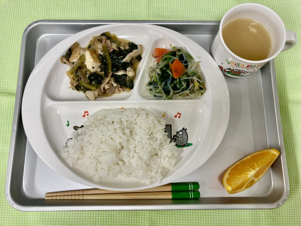 ごはん・なめこの味噌汁・豚肉のうま煮・和風春雨サラダ・オレンジ