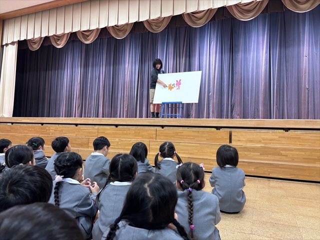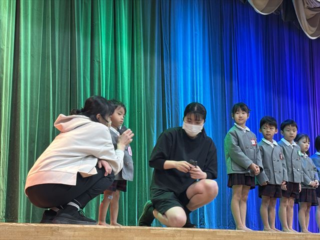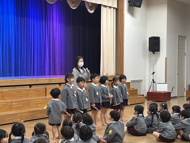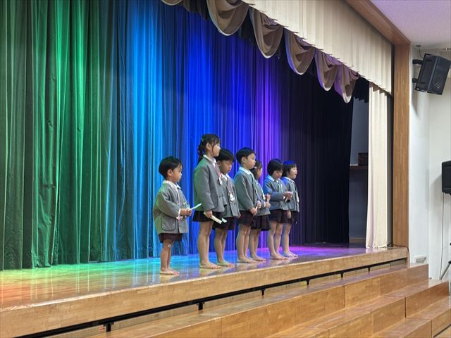 幕が上がると、舞台には11月生まれのお友だちが並んでいました。担任の先生から名前を呼ばれると、元気なお返事が聞こえましたよ。ドキドキしているお友だちもいましたが、マイクを通してインタビューに答えました🎤