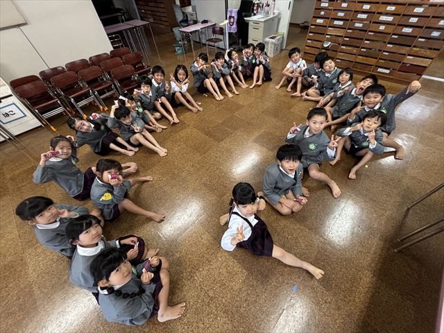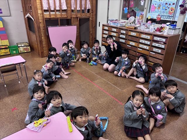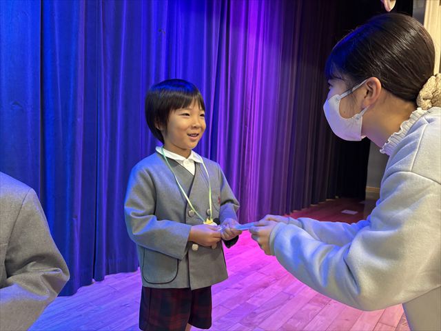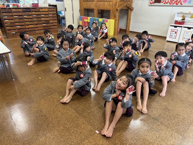 担任の先生からプレゼントを受け取ると、にこにこ笑顔のお友だちです😄大切に使ってくださいね!