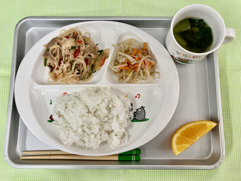 ごはん・チンゲンサイの中華スープ・チャプチェ・もやしのナムル・オレンジ