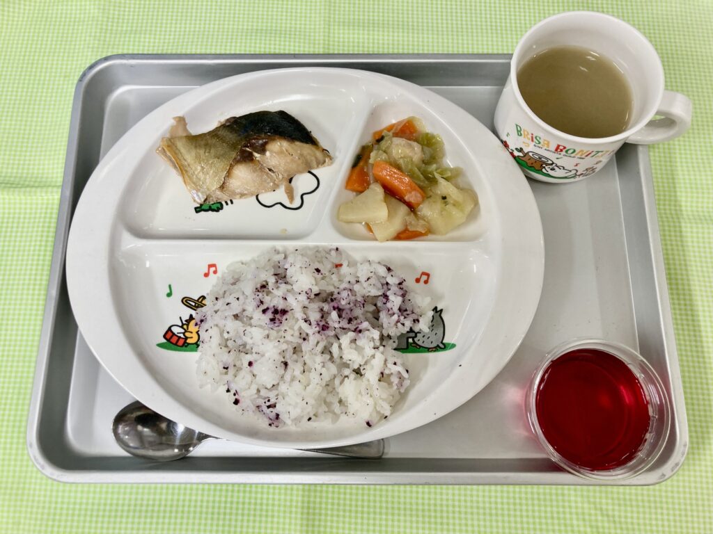 ゆかりごはん・オクラの味噌汁・あじのみりん焼き・野菜の和風煮・ぶどうゼリー