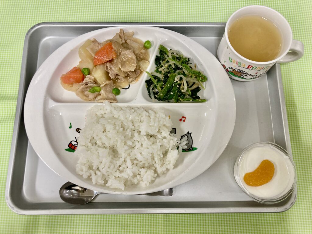 ごはん・大根の味噌汁・肉じゃが・ほうれん草のごま和え・みかんヨーグルト