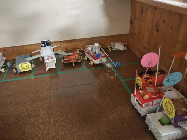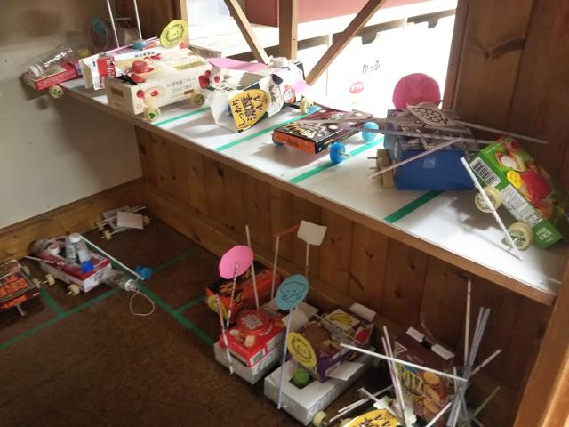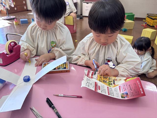 自分が考えたこと、イメージしたものを作る楽しさ、製作ながら「牛乳パックは固い」「卵のパックはハサミですぐに切れる」「ペットボトルのキャップを付けたら回る」などの新たな発見に繋がり、どんどん遊びが広がっていきます。