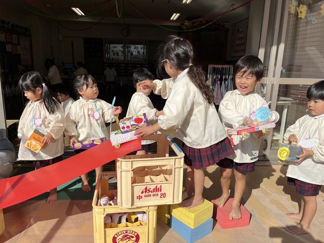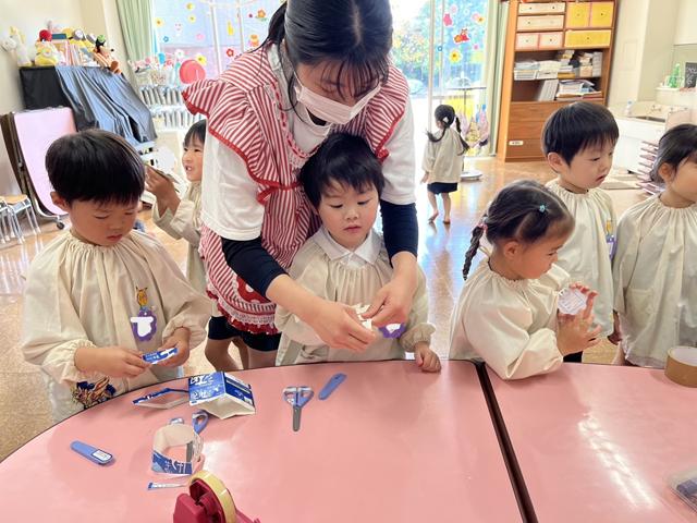 桜組では11月下旬より、ご家庭から空き箱やカップを持ってきていただき、それらを使って、製作遊びを楽しむ姿が見られます。