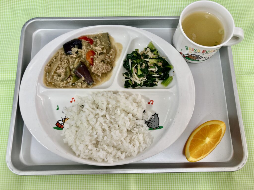 ごはん・中華風コーンスープ・麻婆なす・小松菜とえのきの中華風和え物・オレンジ