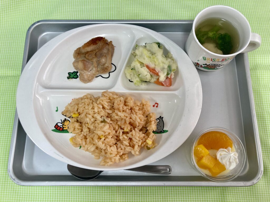 ケチャップライス・花野菜スープ・ローストチキン・ポテトサラダ・プリンアラモード