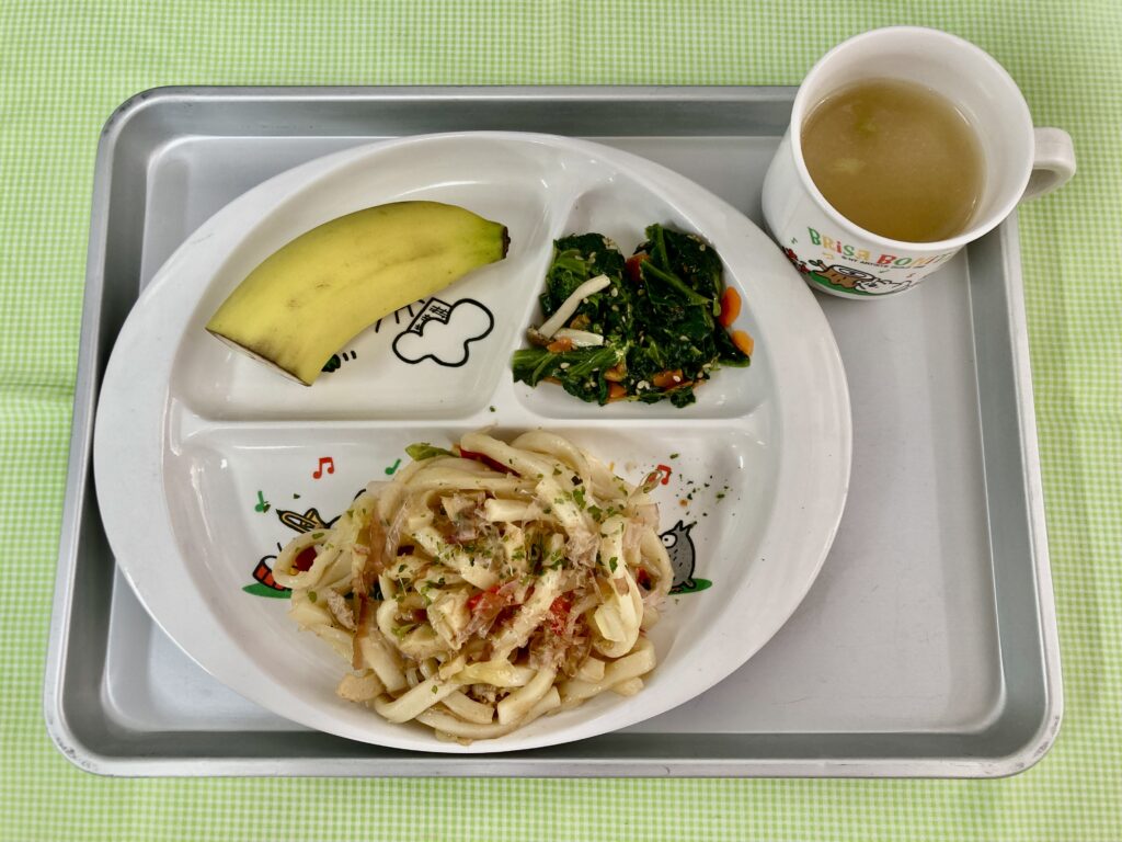 焼きうどん・里芋の味噌汁・ほうれん草の和風サラダ・バナナ