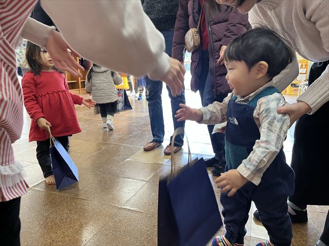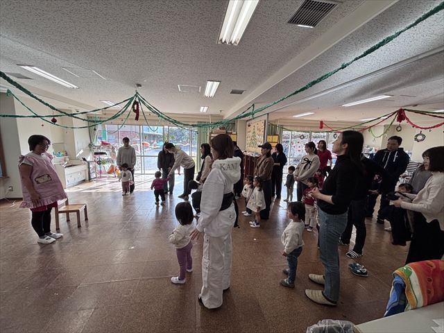 お集まりではピアノに合わせて「おもちゃのチャチャチャ」「あわてんぼうのサンタクロース「おはようのうた」を歌い、挨拶をしました。