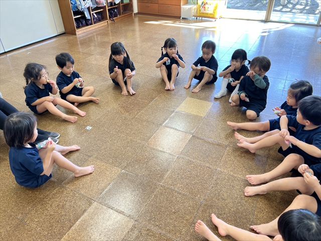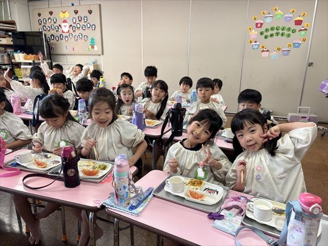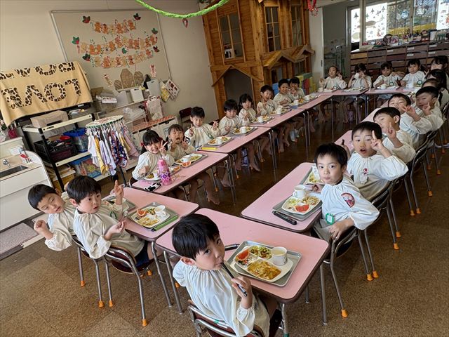お部屋に戻っておやつをいただきました。また、今日で二学期の給食が最後でした。だいすきなチキンカレーには、11月のさつまいも掘りで収穫したさつまいもが入っていました🍠みんなで美味しくいただきましたね。お給食を作ってくださる方、運んでくださる方に感謝の気持ちを込めてご挨拶もしました🍛