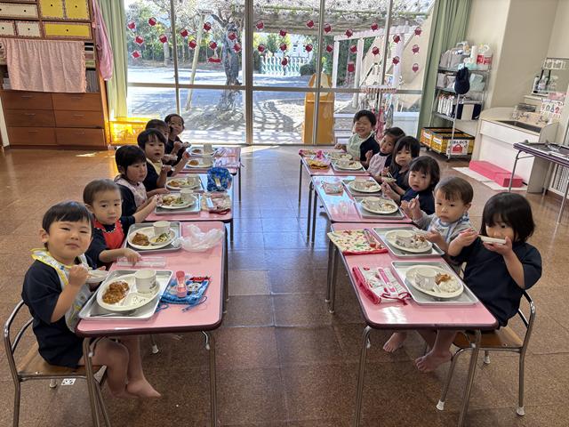 給食を頂く前に椅子の座り方や箸の持ち方などを先生と一緒に確認しながら美味しく頂きました。