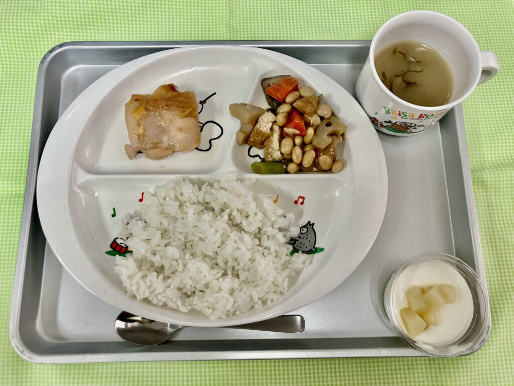 ごはん・もずくの味噌汁・鶏肉のマーマレード焼き・五目煮・ピーチヨーグルト