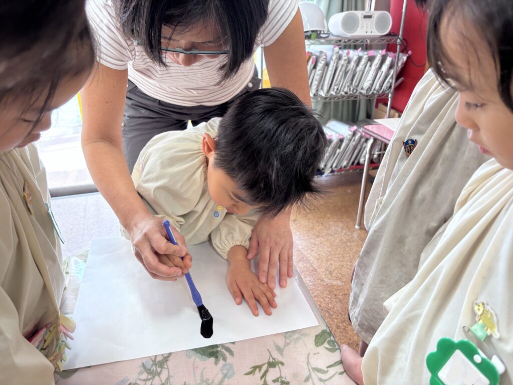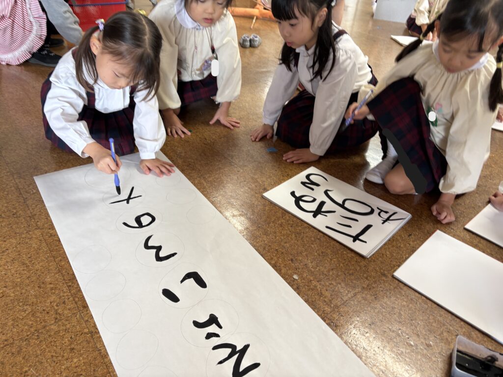 それを見ていた梅組、桜組の子どもたちは「松組さん、すごいね!」「“もりのたからもの”って書いてくれてるの?」「私たちも松組さんになったらするの?」と憧れの眼差しで見ていました。