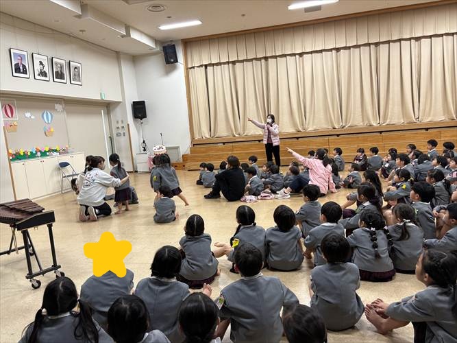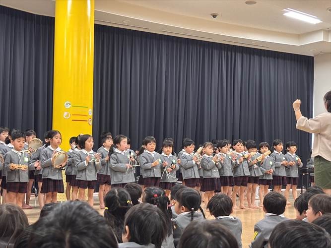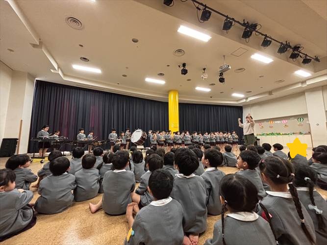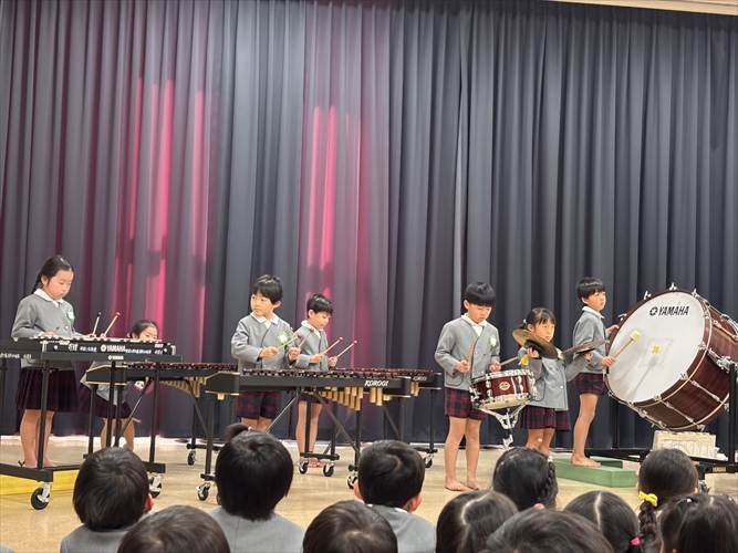 パンダ組やさくら組、うめ組のお友だちも初めて聞くシロフォン・グロッケン・バスマスターの音色や大太鼓・小太鼓・シンバルの音によく興味を示していましたね。