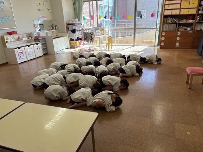 聖徳大学附属浦安幼稚園では年に1度、地震・津波を想定した避難訓練を行っています。