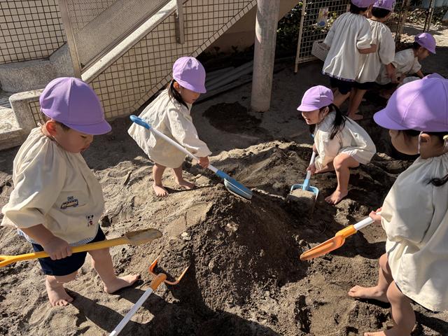 今週、給食で食べたお汁粉を真似して砂場では水と砂をかき混ぜて『お汁粉作り』。