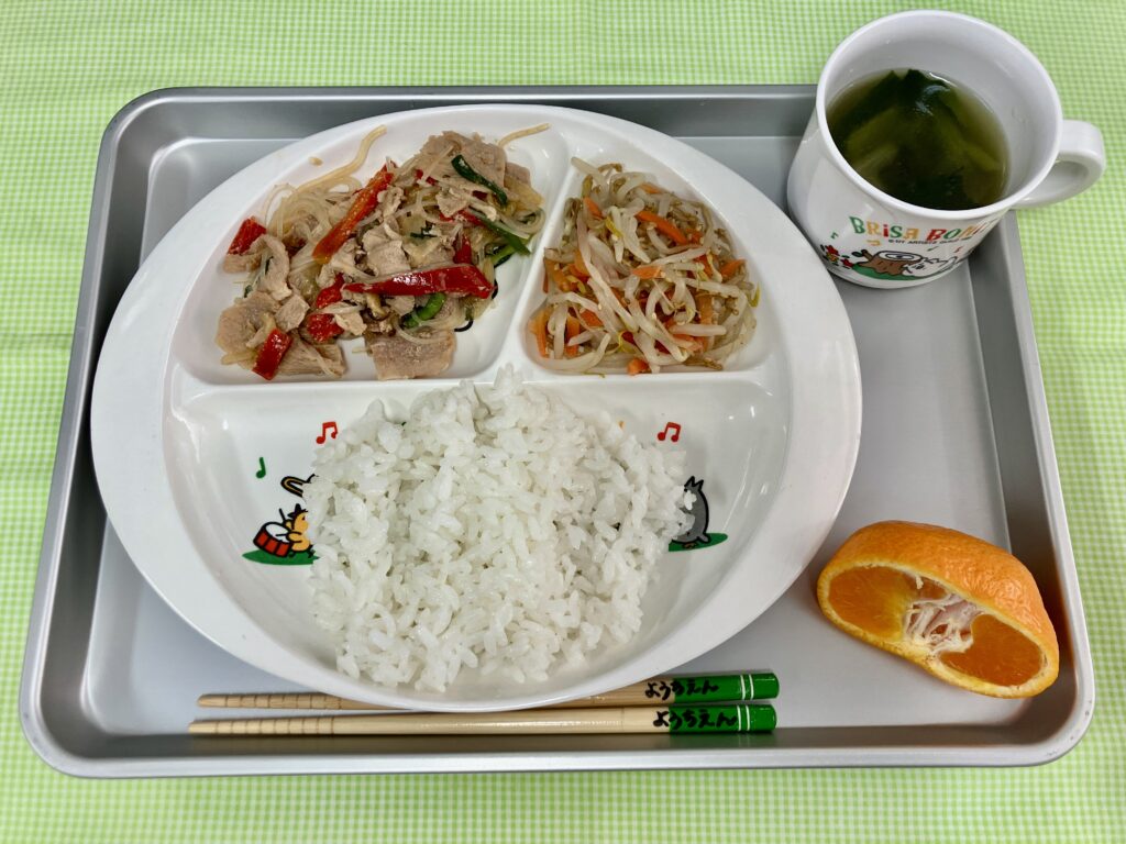 ごはん・ちんげん菜の中華スープ・チャプチェ・もやしのナムル・みかん
